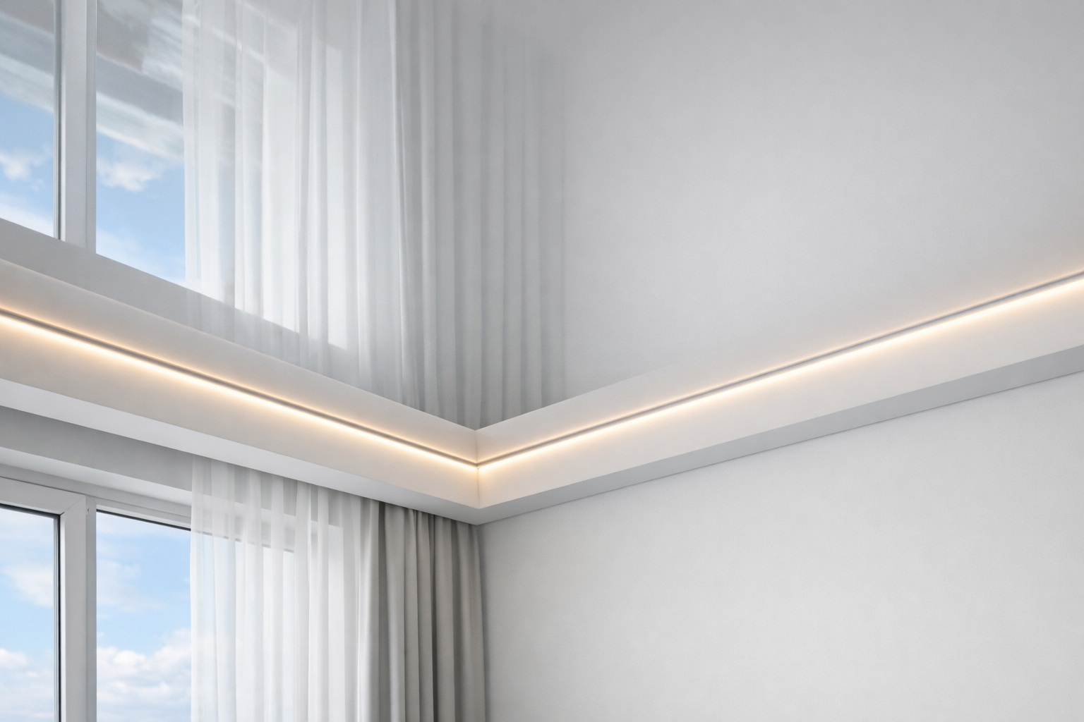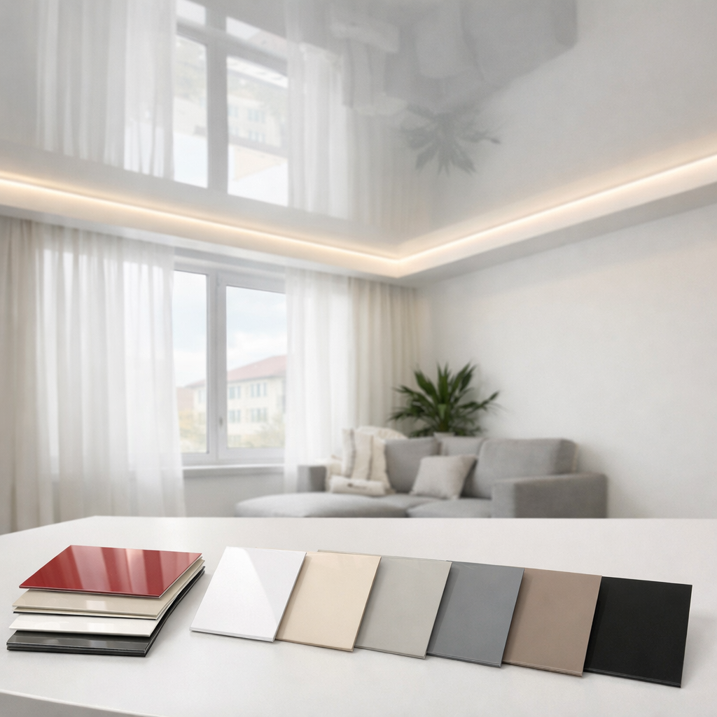 Глянец визуально расширяет пространство и усиливает свет. Мы подберём цвет и сценарий освещения, чтобы потолок выглядел премиально — без «дешёвого зеркала».